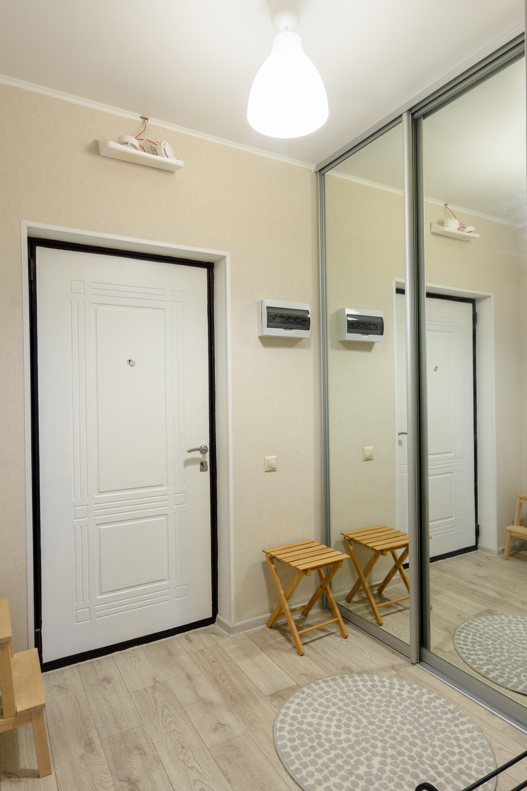 Hallway interior, large fitted wardrobe with large mirrors on the doors, entrance metal door