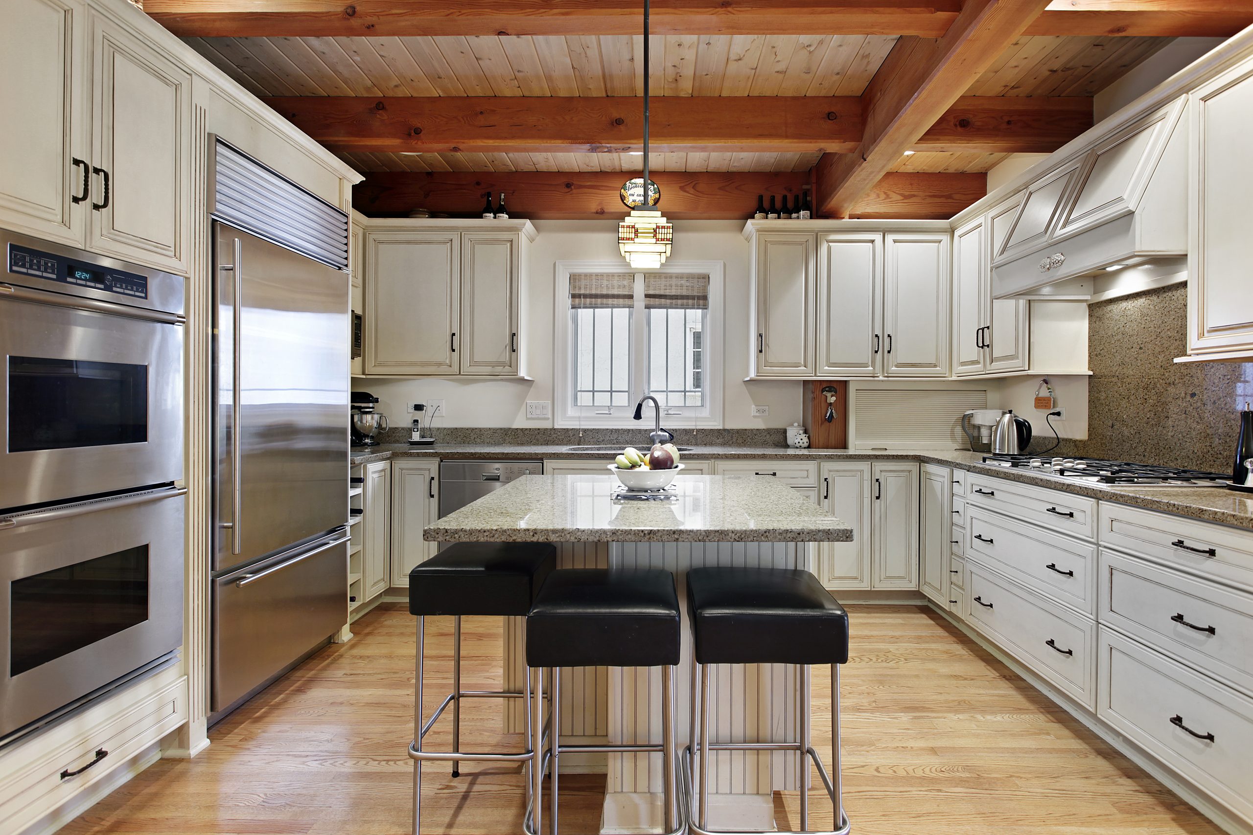 Kitchen with wood ceiling beams