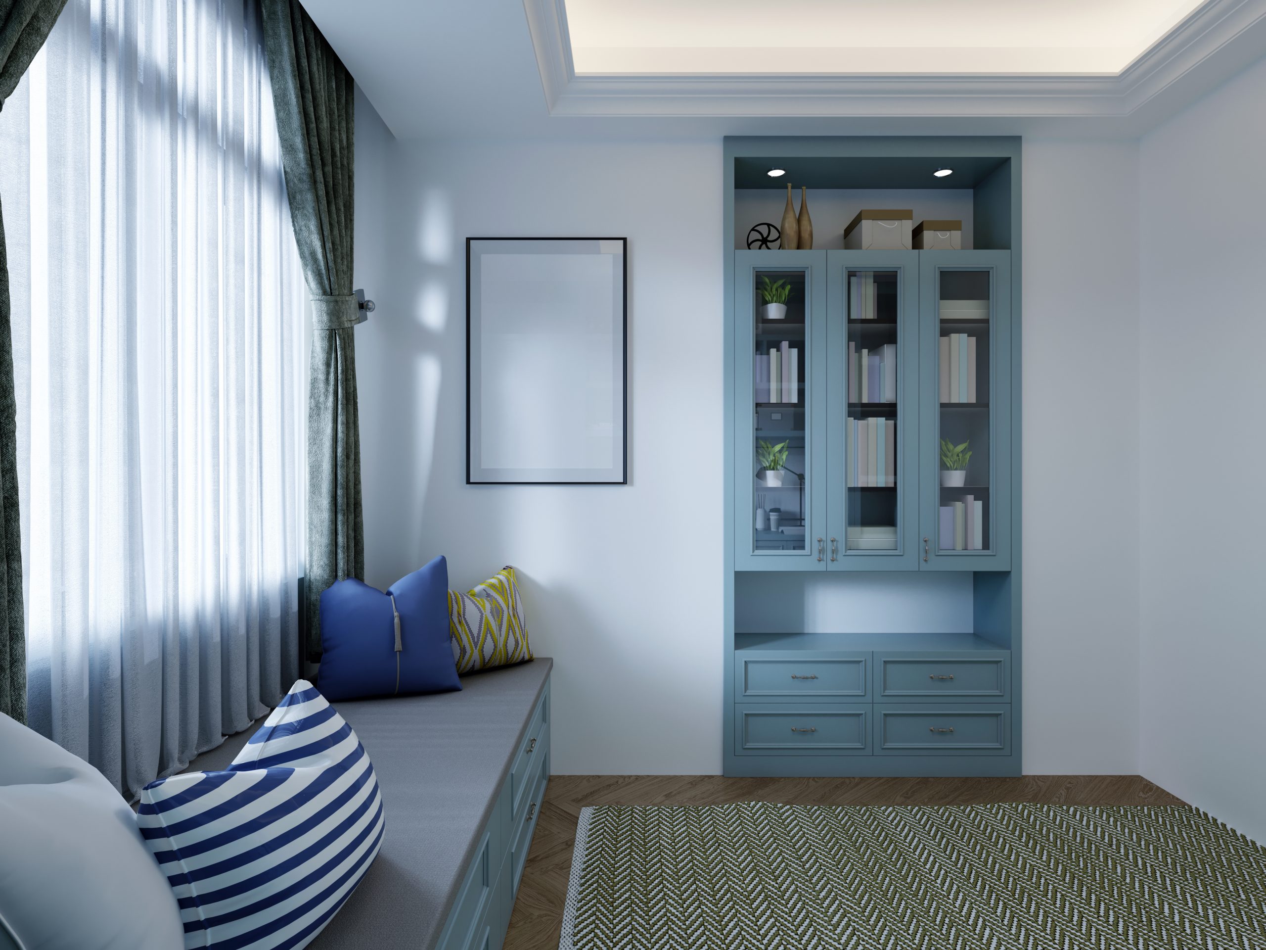 A turquoise bookcase with books and a bench with pillows in the children's room.